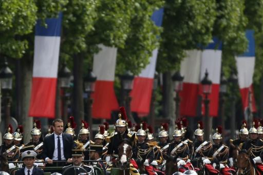 Emmanuel Macron (c) desfila por la avenida parisina de los Campos Elíseos el 14 de mayo de 2017, tras ser investido oficialmente presidente de Francia afp_tickers