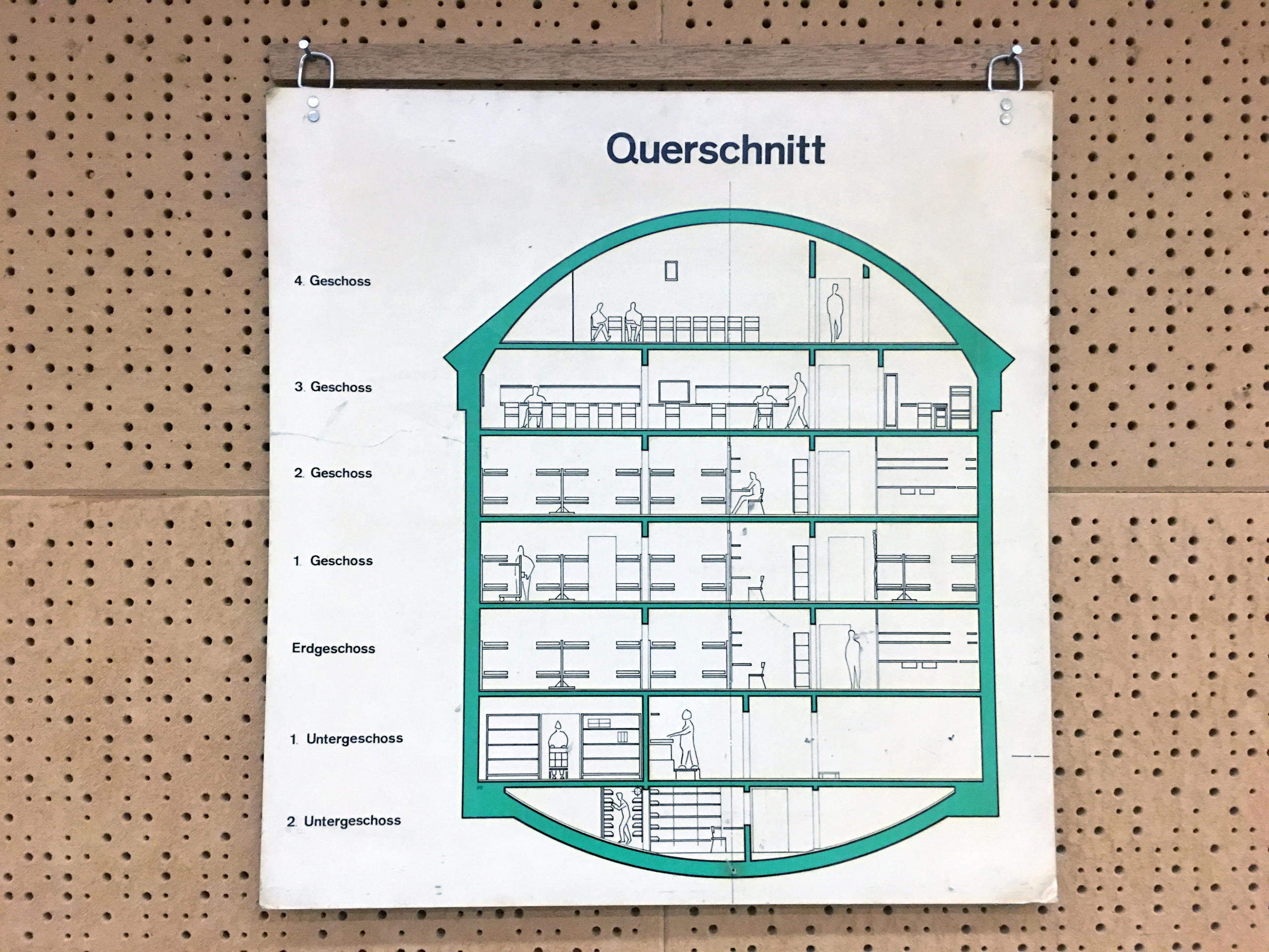 La planta baja que aparece en este croquis (Erdgeschoss) está al nivel de los túneles de la autopista. El suelo actual está por encima del cuarto piso (4. Geschoss).