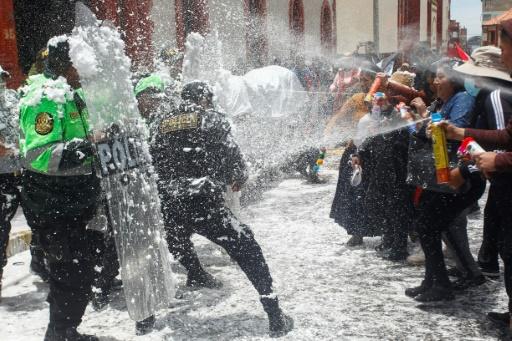 Una protesta antigubernamental en Puno, en los Andes peruanos, se convirtió este miércoles en una fiesta de carnaval con manifestantes y policías rociándose mutuamente espuma y agua, un gesto amistoso que contrasta con la violenta convulsión social que vive Perú desde diciembre.