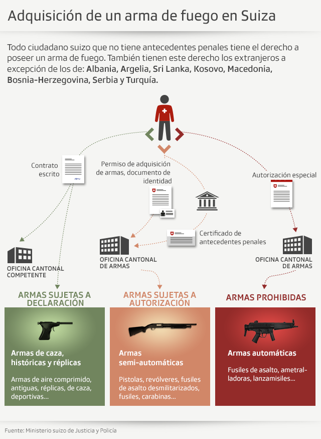 La alta densidad de armas en Suiza no se debe únicamente al hecho de que los soldados puedan llevarse sus armas de servicio a casa. También se explica por la legislación bastante liberal en este ámbito. Algo que podría cambiar muy pronto. Y es que el Gobierno y el Parlamento quieren reforzar las normas sobre la posesión de armas de fuego y adaptarlas a las directivas de la Unión Europea (UE)Enlace externo.