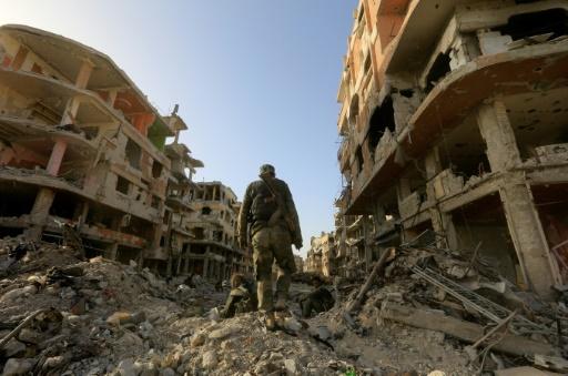 Un soldado sirio camina entre los escombros a la entrada del campo de Yarmuk, en la periferia sur de la capital siria, Damasco, el 21 de mayo de 2018 afp_tickers