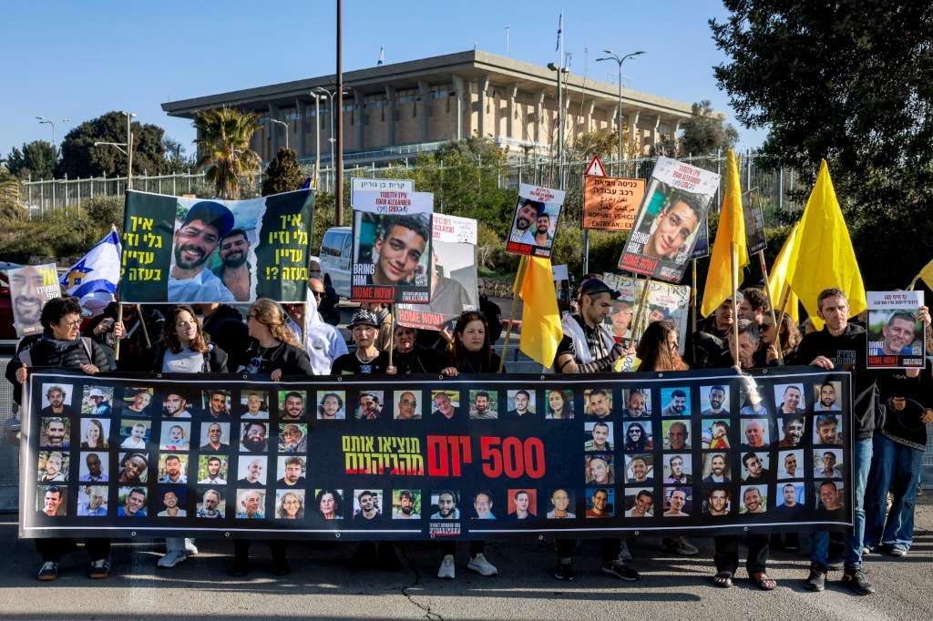 Con fotos de sus seres queridos, familiares de rehenes israelíes retenidos en la Franja de Gaza se manifestaron este lunes, cuando se cumplen los 500 días del cautiverio que sufren sus parientes, e instaron a las autoridades a trabajar por su liberación.
