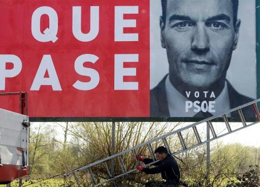 Un operario desmonta la escalera tras pegar un cartel electoral del presidente del Gobierno español, el socialista Pedro Sánchez, con el lema de campaña 'Haz que pase', este viernes 12 de abril en el pueblo de Viella (Asturias), al norte de España afp_tickers