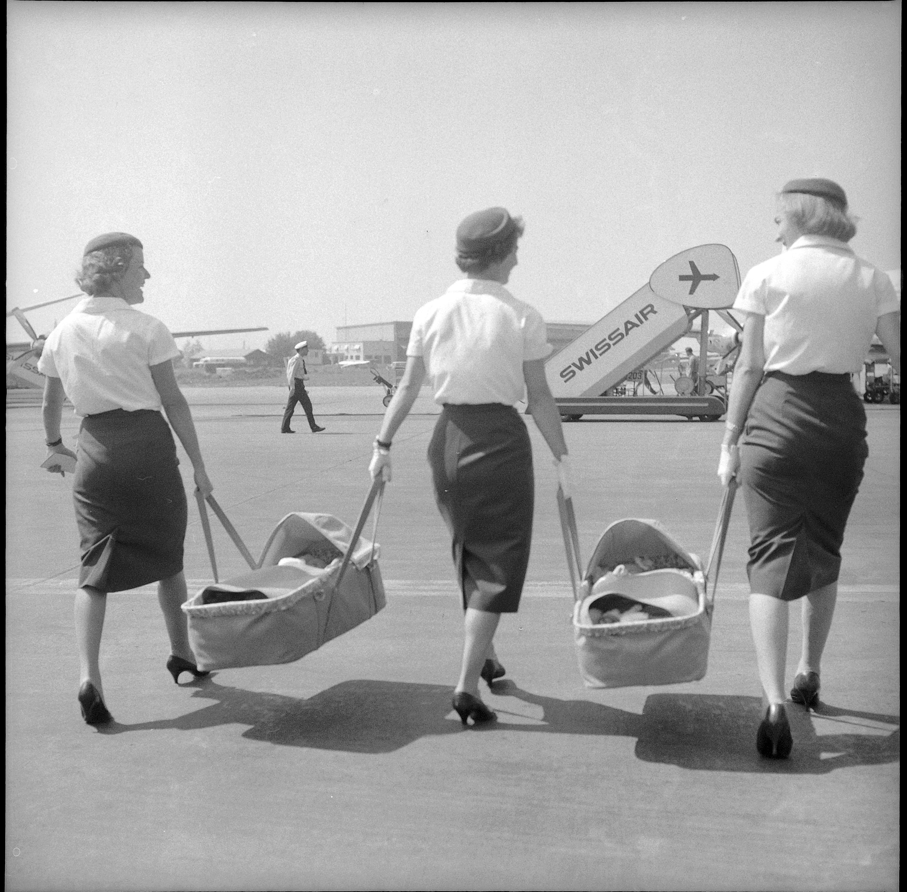 1959 en Kloten: las azafatas de Swissair atienden a los pasajeros más jóvenes. (RDB)