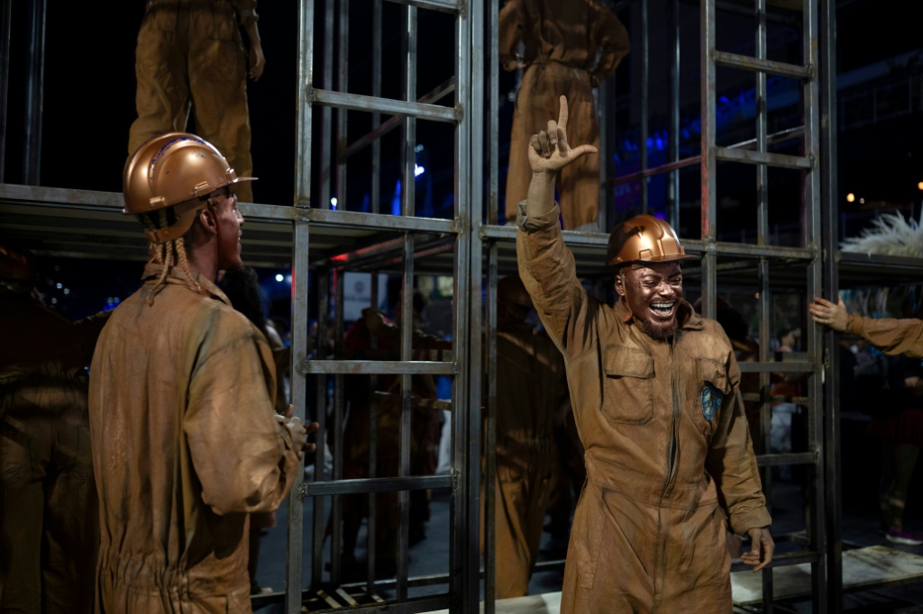 Durante el ensayo abierto al público, una gran pantalla sobre un camión muestra imágenes del expresidente ultraderechista Jair Bolsonaro (2019-2022) con uniforme de presidiario o con las manos manchadas de sangre, en alusión a las muertes durante la pandemia de covid.