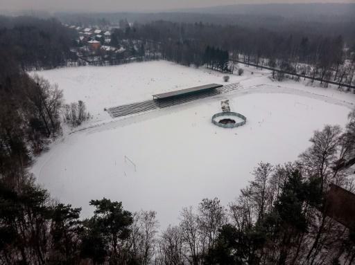 En un estadio de fútbol en esta ciudad de la región minera de Silesia, un enorme hueco se ve bien delimitado en medio del césped cubierto de nieve recién caída.