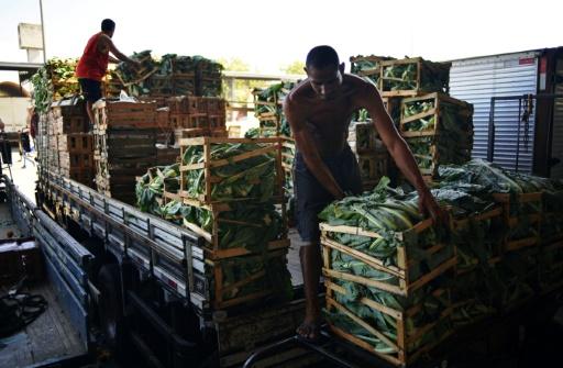 Trabajadores del mercado CEASA, en Rio de Janeiro, descargan verduras de un vehículo durante la huelga de camioneros en Brasil, el 29 de mayo de 2018 afp_tickers