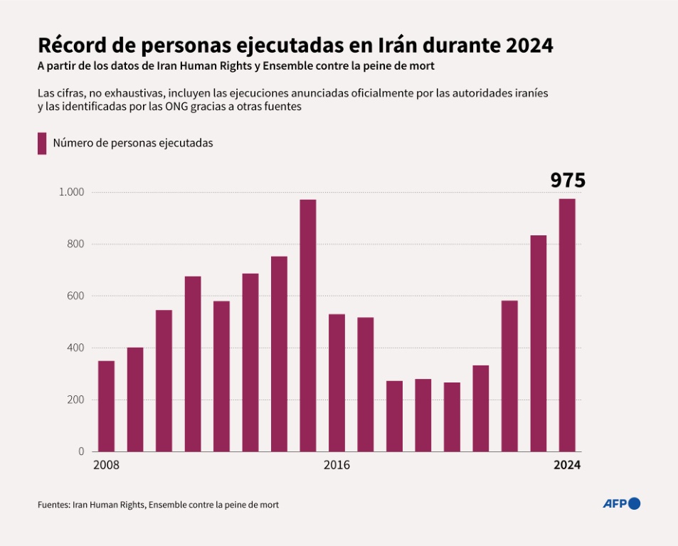 Al menos 975 personas fueron ejecutadas en Irán en 2024, informaron este jueves dos organizaciones de derechos humanos, que denuncian una «terrible escalada» del uso de la pena capital.