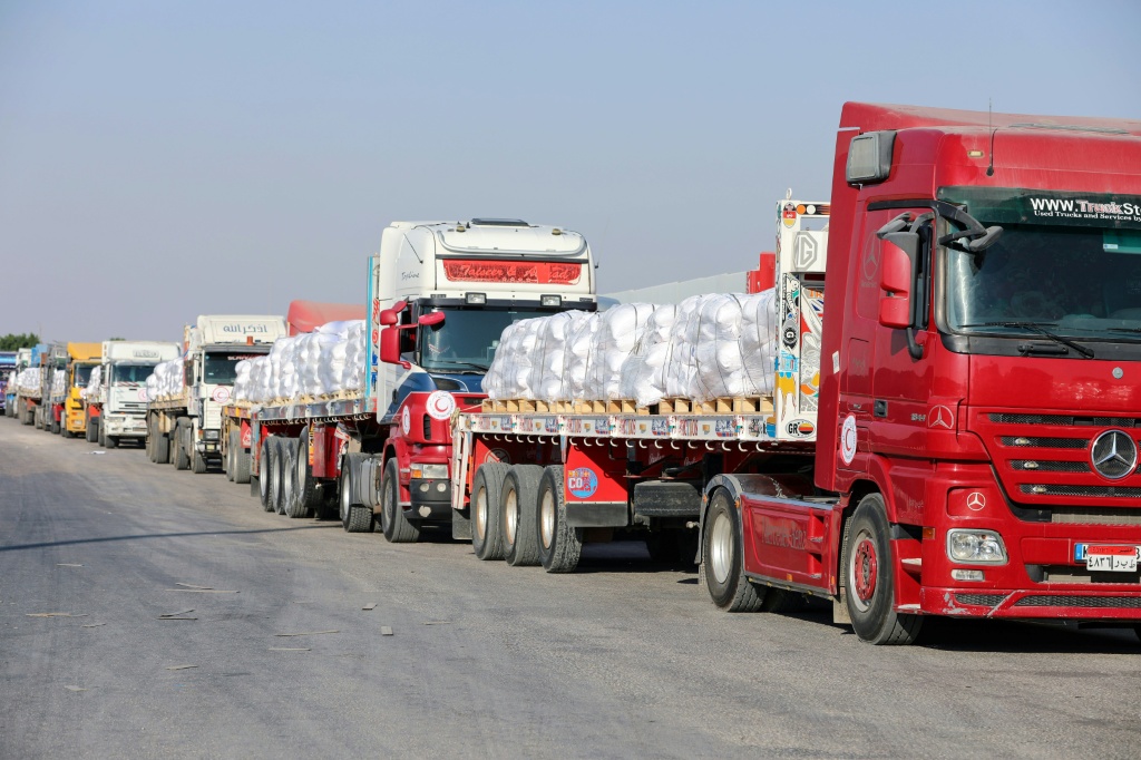 Imágenes de AFP muestran una fila de camiones cargados con sacos blancos cruzando, por el lado egipcio, la entrada de la terminal de Rafah, que conduce al sur del territorio palestino.