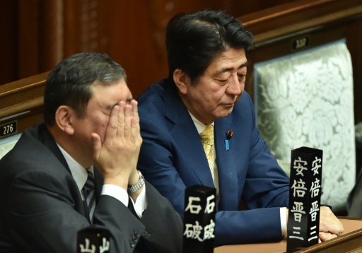 El primer ministro de Japón, Shinzo Abe (d), y el ministro de Revitalización Regional, Shigeru Ishiba, escuchan un discurso de la oposición durante una sesión plenaria en el parlamento, en Tokio, el 16 de julio de 2015 afp_tickers