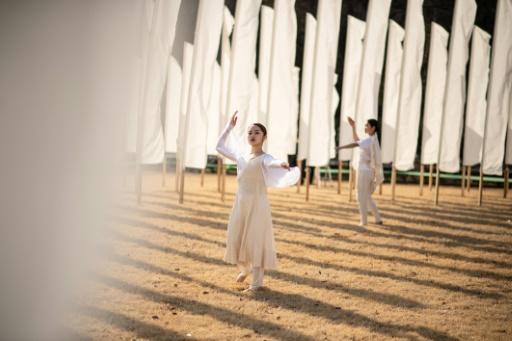 Unas bailarinas participan en una ceremonia para rendir homenaje a las víctimas del terremoto y el tsunami de hace once años en Japón el 11 de marzo de 2022 en el parque Hibiya de Tokio afp_tickers