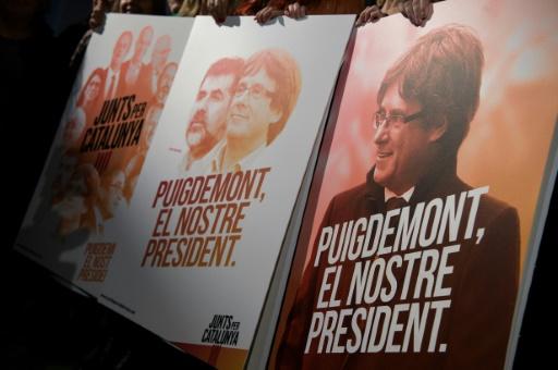 Miembros de la candidatura Junts per Catalunya sostienen carteles para la campaña electoral catalana con la imagen de Carles Puigdemont, el pasado 28 de noviembre en Barcelona afp_tickers