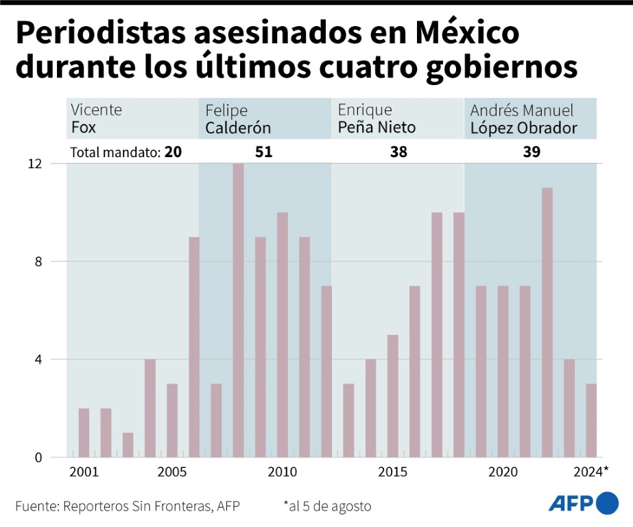 Durante el gobierno de Felipe Calderón (2006-2012), quien lanzó una polémica ofensiva militar antidrogas, hubo 58 comunicadores asesinados, mientras que en el de Enrique Peña Nieto (2012-2018) sumaron 38, según un recuento de RSF.