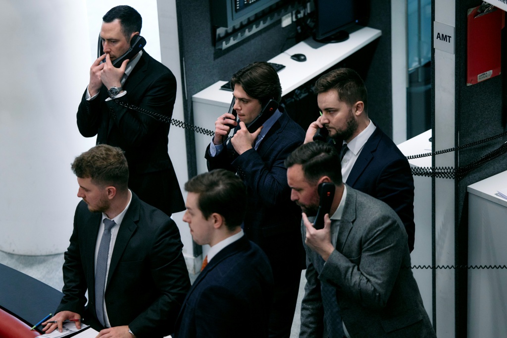 Detrás de ellos, los corredores de bolsa hablan con sus clientes por teléfono fijo, algunos con uno en cada oído.