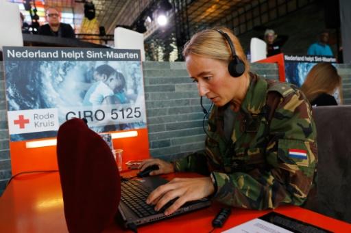 Una mujer en el servicio militar de Holanda contesta el teléfono para recibir donaciones durante el Evento Nacional de Caridad de la Cruz Roja holandesa "Holland Helps Saint-Martin", en Hilversum, el 15 de septiembre de 2017. afp_tickers