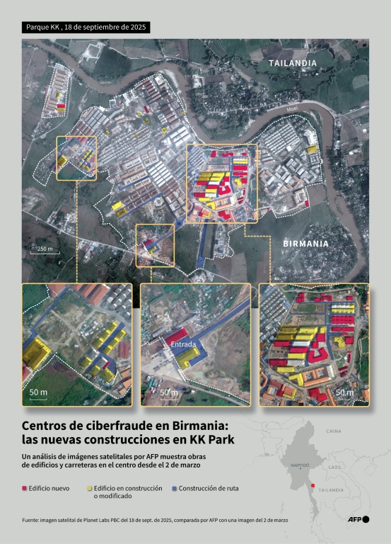 Imágenes satelitales muestran lo que parecen ser edificios de oficinas y dormitorios en construcción en muchos de los centros de estafa cerca de la frontera entre Birmania y Tailandia.