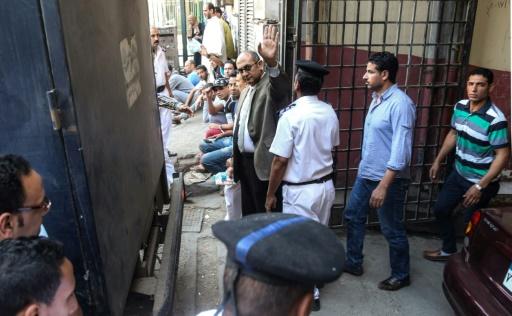 El excandidato presidencial egipcio y abogado de derechos humanos Khaled Ali (C) saluda mientras sale de una estación de policía en el vecindario Dokki, en el distrito occidental de Giza, capital de El Cairo, el 24 de mayo de 2017, tras ser liberado bajo fianza. afp_tickers