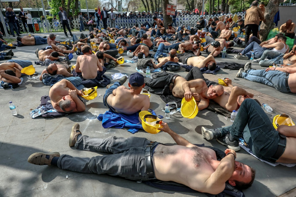 Los 110 mineros caminaron 180 kilómetros durante nueve días desde la provincia de Eskisehir (centro) hasta la capital, Ankara, y realizan una sentada con el torso desnudo frente al Ministerio de Energía desde hace una semana para exigir una reunión con el ministro.