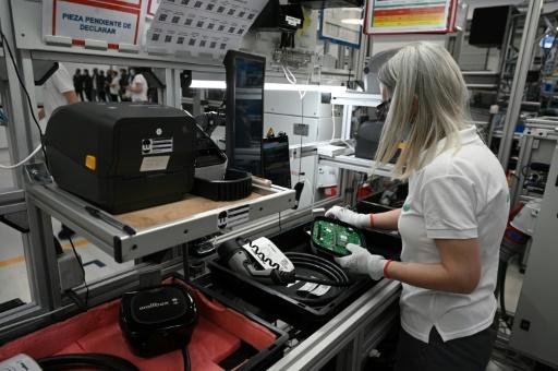 Un empleado trabaja en una fábrica de puntos de recarga para vehículos eléctricos y viviendas, el 20 de abril de 2022 en la ciudad española de Barcelona afp_tickers