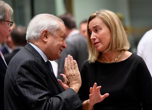 Federica Mogherini habla con el secretario de Estado español para la UE, Fernando Valenzuela, a su llegada a la reunión de responsables de Exteriores europeos de este lunes 11 de noviembre en Bruselas afp_tickers