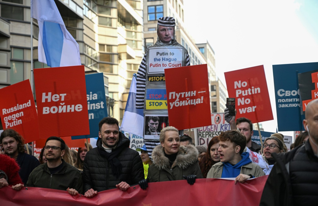 Cientos de personas marcharon el sábado por el centro de Berlín junto a la viuda del líder opositor ruso Alexéi Navalni para exigir a Rusia que detenga su invasión de Ucrania.