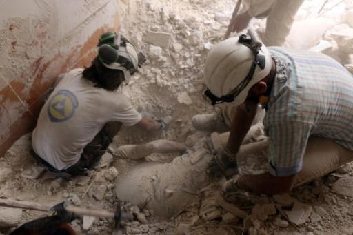 Voluntarios sirios de cuerpos civiles de defensa retiran los escombros de un edificio para sacar el cuerpo de un fallecido en un ataque de las fuerzas gubernamentales, el 27 de mayo de 2016, en Alepo afp_tickers