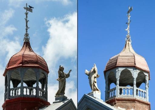 En lo alto del edificio hay una estatua de Jesucristo sin cabeza y con los brazos extendidos.