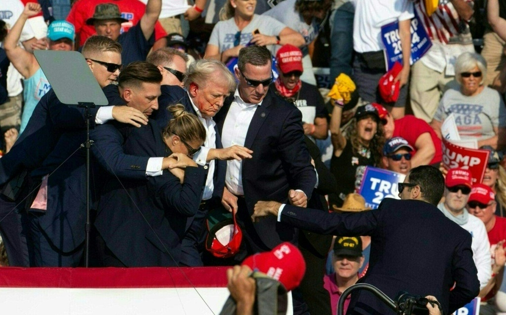 Trump se agarró la oreja derecha mientras se oía «¡bájate!», antes de un quinto y sexto disparo.