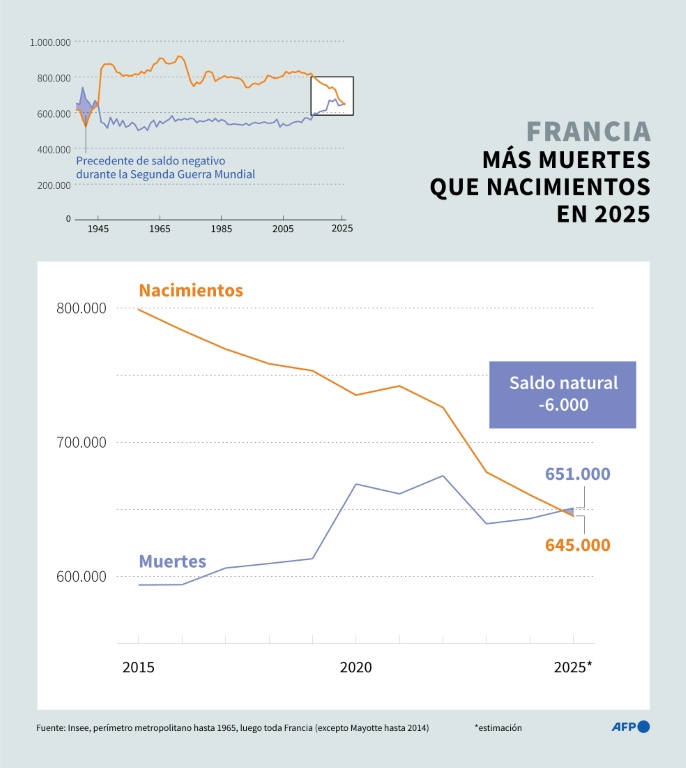 Francia registró más decesos que nacimientos en 2025, por primera vez desde el final de la Segunda Guerra Mundial, indicó este martes el instituto nacional de estadísticas Insee, en un contexto de debate sobre una caída de la natalidad.