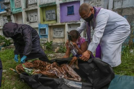 «No quiero que tiren sus restos mortales», explica a la AFP Corazon Enriquez, su madre de 63 años, mientras los dos hombres con mascarilla y trajes protectores se llevan lo que queda de su hijo.