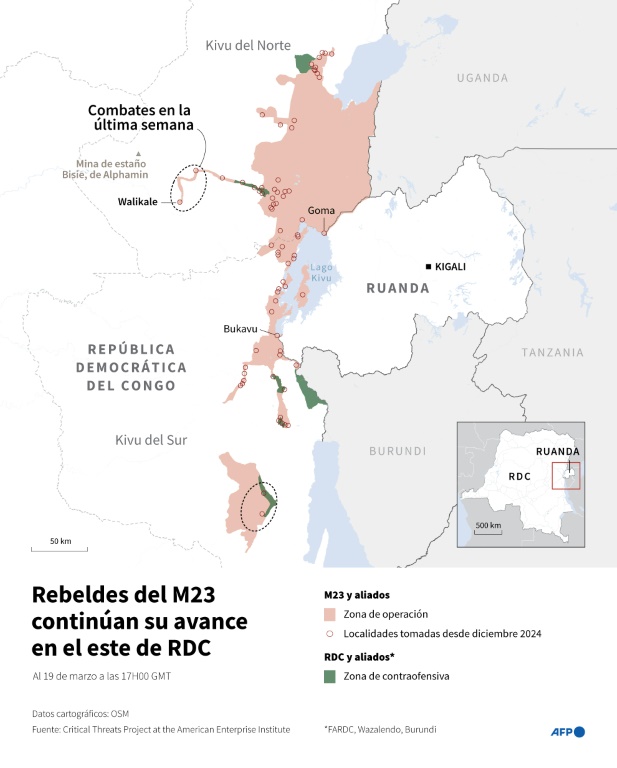 Los rebeldes del M23, un grupo insurgente apoyado por Ruanda, tomaron la localidad de Walikale, una posición clave en el este de República Democrática del Congo donde hay importantes yacimientos mineros, informaron este jueves varias fuentes.
