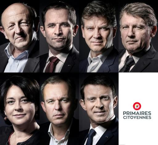 Combinación de retratos del 9 de enero de 2017 de los candidatos a las primarias socialistas francesas (I-D): Jean-Luc Bennahmias, Benoît Hamon, Arnaud Montebourg, Vincent Peillon, Sylvia Pinel, Francois de Rugy y Manuel Valls afp_tickers