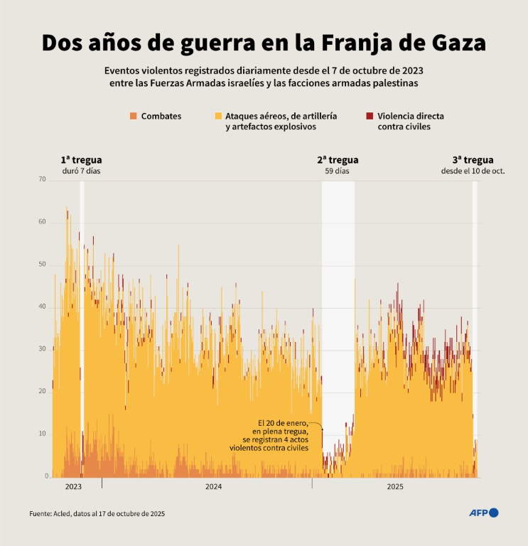 La guerra en Gaza fue provocada por el ataque de Hamás a Israel en octubre de 2023, que causó la muerte de 1.221 personas, en su mayoría civiles, según un balance elaborado por AFP a partir de datos oficiales.