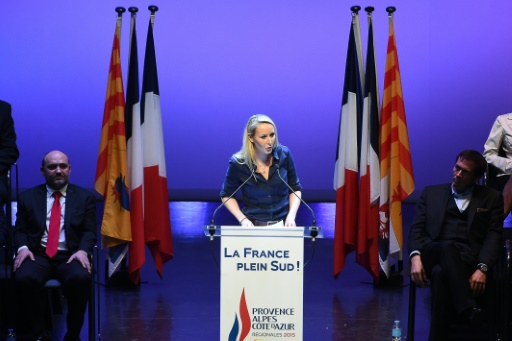 La candidata del partido francés de extrema derecha Frente Nacional para las elecciones regionales de diciembre en Provenza Alpes Costa Azul, Marion Maréchal-Le Pen, pronuncia un discurso en un acto de campaña, en Tolón, el 1 de diciembe de 2015 afp_tickers