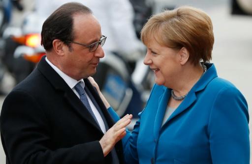 La canciller alemana, Angela Merkel, saludando al presidente francés, François Hollande, a su llegada para un encuentro informal en el Palacio Herrenhausen en Hanover, el 25 de abril de 2016 afp_tickers
