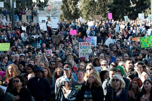 Con banderas de los colores del arco iris y estadounidenses, la multitud cantó los eslóganes convertidos en refranes de estas manifestaciones: «¡Resistan!» o «¡No odien! ¡No tengan miedo! ¡Los refugiados son bienvenidos!»