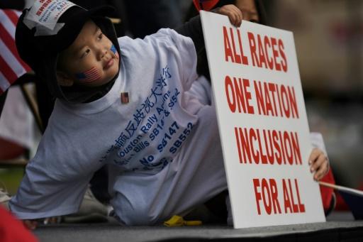 Una niña sostiene un cartel durante una protesta en Houston contra un proyecto de ley que prohibiría a los ciudadanos chinos comprar propiedades en Texas, el 11 de febrero de 2023 afp_tickers