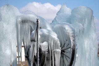 Arte de la naturaleza sobre el arte humano: Escultura de Joe Siffert, obra de Jean Tinguely, en Friburgo, cubierta de hielo.