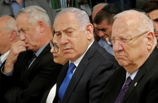 El presidente israelí, Reuven Rivlin (D), el primer ministro Benjamin Netanyahu (C), y su rival, Benny Gantz (I), el 19 de septiembre de 2019 durante una ceremonia en Jerusalén afp_tickers