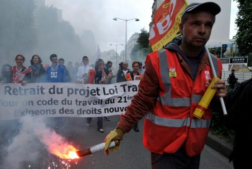 Un hombre con un chaleco del sindicato CGT con una bengala durante la manifestación en Rennes contra la reforma laboral planteada por el Gobierno, el 5 de julio de 2016 afp_tickers