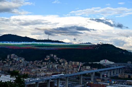 Aviones de la patrulla acrobática del ejército del aire italiano sobrevuelan el puente inaugurado en Génova, el 3 de agosto de 2020 afp_tickers