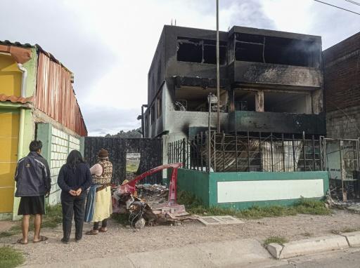 Tres personas observan una casa de Juli, en la región andina peruana de Puno, quemada durante los enfrentamientos entre la policía y los manifestantes opuestos al gobierno de la presidenta, Dina Boluarte, el 5 de marzo de 2023 afp_tickers