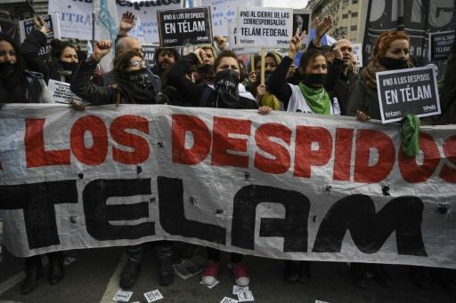 Periodistas, delegados sindicales y representantes de agrupaciones políticas opositoras marcharon este jueves en Buenos Aires en rechazo al despido de 357 trabajadores de la agencia oficial de noticias de Argentina Telam, lo que representa 40% de la plantilla de unas 900 personas.