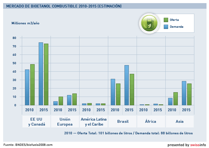 A escala mundial, en 2007 se produjeron 52 mil millones de litros de bioetanol, es decir, tres veces más que en el año 2000.