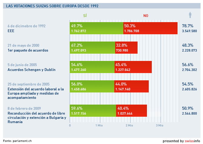 Las relaciones entre Suiza y la UE (en las áreas del comercio, mercados públicos, agricultura, transporte terrestre y aéreo, e investigación) se basan en un paquete de acuerdos, todos ellos vinculados jurídicamente. De haber ganado el ‘no’ en el referéndum, estos convenios hubieran quedado caducos.