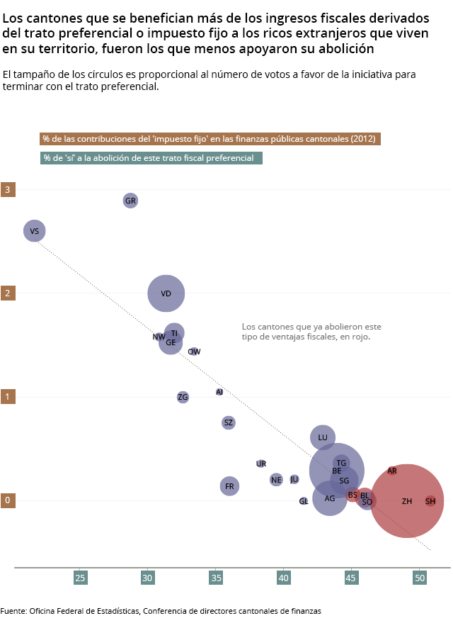 La relación entre el voto para abolir este trato preferencial y los ingresos cantonales por estas recetas fiscales se ilustra en una diagonal (línea punteada). Los cantones con mayores ingresos provenientes de este impuesto fijo – Grisones (GR), Valais (VS), Vaud (VD), Tesino (TI), Nidwald (NI) et Ginebra (GE) – rechazaron claramente la iniciativa. El cantón de Schaffhausen (SH), que abolió ya este sistema a escala cantonal, fue el único que aceptó la iniciativa, seguido de otros cantones en la misma situación (Zúrich (ZH), Basilea-Ciudad (BS), Basilea-Campo (BL) et Appenzell Rodas-Exteriores (AR) – en rojo en el gráfico).