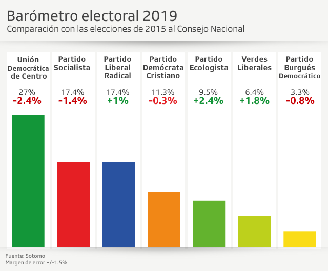 Los partidos de la derecha bajarían un 1,4% (Unión Democrática de Centro y Partido Liberal Radical juntos), mientras que la izquierda ganaría un 1% (sumados el Partido Socialista y el Partido Ecologista)