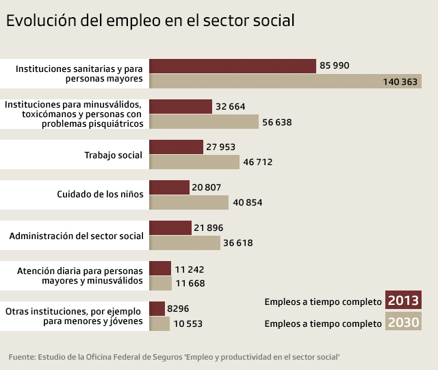 Suiza deberá ampliar su sistema social de manera “dramática” en el curso de los años por venir, escribía de manera reciente el semanario ‘Sonntagszeitung’ con base en el estudio de la Oficina Federal de Seguros Sociales (OFAS) ‘Empleo y productividad en el sector social’Enlace externo. La investigación estima que 134 000 empleos a tiempo completo deberán ser creados de aquí a 2030, como lo confirma Olivier Brunner-Patthey, de esa dependencia. Subraya que no se trata de cifras oficiales de la Confederación, sino que son el resultado de una investigación efectuada por mandato de las autoridades federales.
