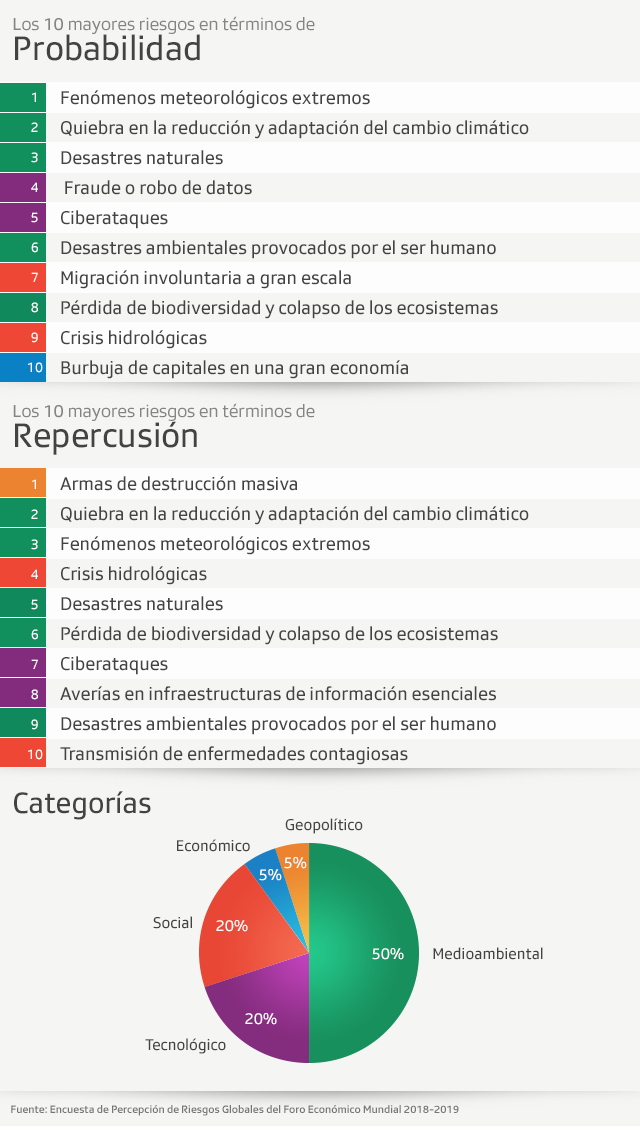El informe anual de riesgos se basa en las conclusiones de unos 1 000 expertos y responsables políticos, y ha sido desarrollado por un consejo asesor del Foro Económico Mundial, universidades de Estados Unidos, Gran Bretaña y Singapur, así como por compañías de seguros líderes en Nueva York y Suiza.