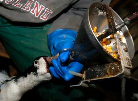 ‘Foie gras’: los gansos y los patos son engordados mediante alimentación forzada varias veces al día. El uso de un tubo de metal insertado en el esófago a menudo causa lesiones. En Suiza, esta práctica se considera cruel con los animales y, por lo tanto, está prohibida.